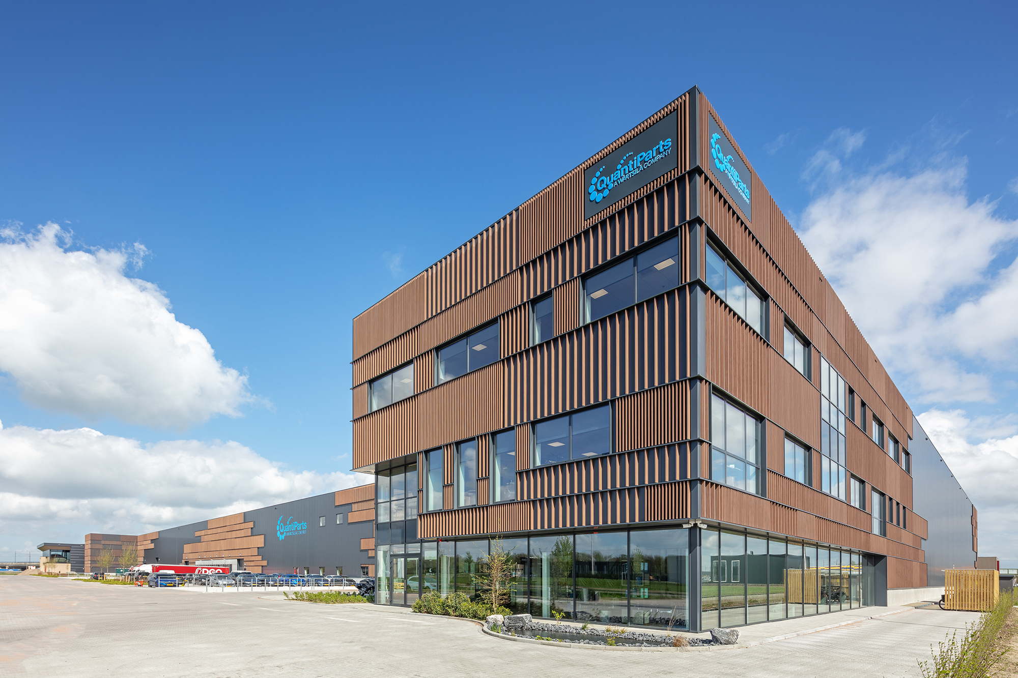 Durch den Einsatz von Sandwichelementen FALK SEC W 100 VB mit verdeckter Befestigung, kombiniert mit stilvollen Designelementen in Holzoptik, ist eine abwechslungsreiche und ästhetisch ansprechende Optik entstanden.