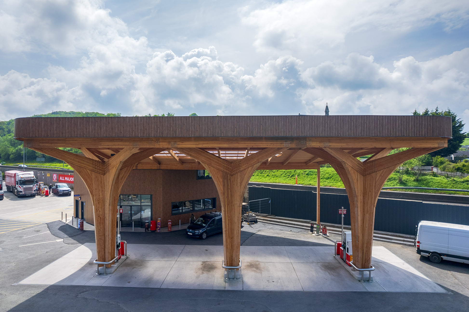 The Junction 20 Fuel Canopy along the M1 in Ravensdale, Co. Louth, Ireland, is a groundbreaking project designed to set new standards for service stations. Operated by local businessman Kieran Byrne and designed by Dundalk-based Van Dijk Architects, this Circle K station features a unique Glulam timber construction designed and fabricated by Glenfort Timber Engineering. The innovative use of timber instead of steel for the canopy and support structures creates a visually stunning and environmentally friendly landmark. As Sophie van Dijk at Van Dijk Architects describes: "We wanted to go with natural materials and shaped it so that it mimics the backdrop of the trees and the mountains.”
