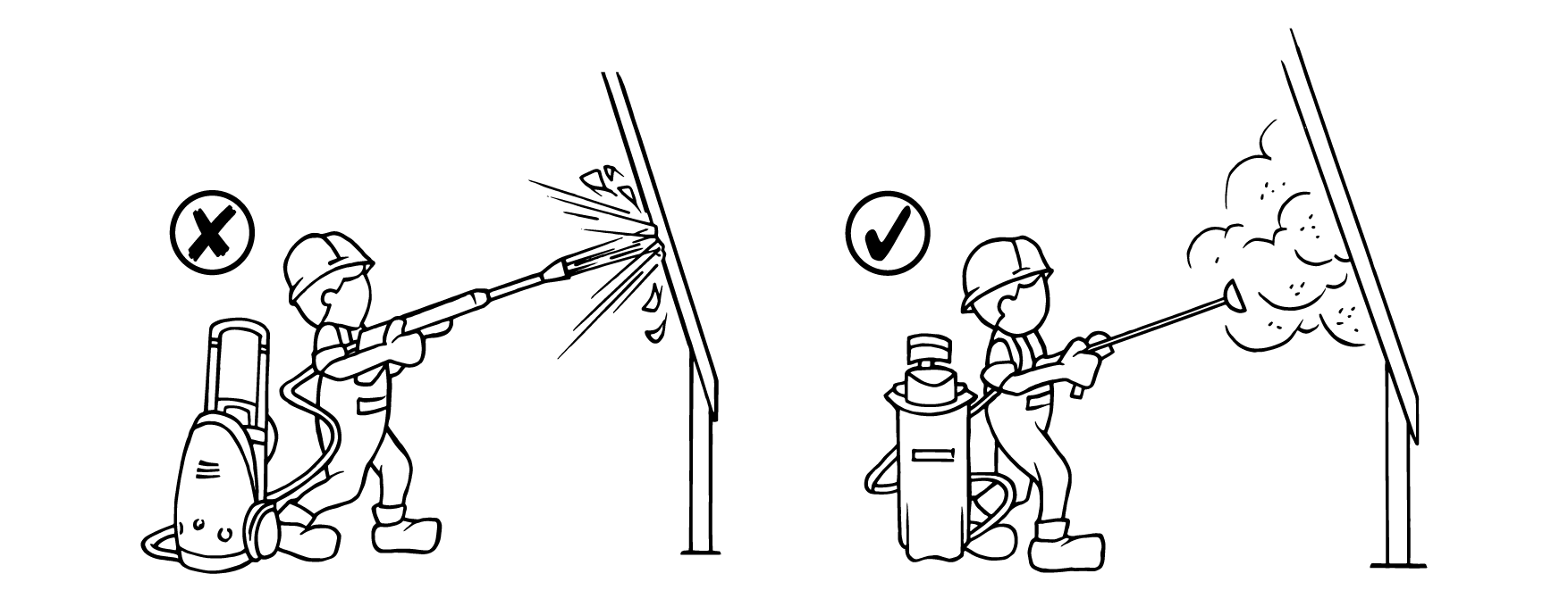 Het zorgvuldig reinigen van een gebouw betekent dat er rekening gehouden wordt met de kwaliteit van de coating en daarvoor de juiste schoonmaakmiddelen gebruikt worden. Algemeen geldt dat het reinigingsmiddel PH-neutraal moet zijn en geen schurende middelen mag bevatten. Denk bijvoorbeeld aan groene zeep. Het reinigingsmiddel dient te worden opgelost in koud of lauw water. Om de coating niet te krassen raden we aan om een zachte borstel te gebruiken voor het verwijderen van vuil van de panelen. Er mag niet onder hoge druk worden gereinigd!