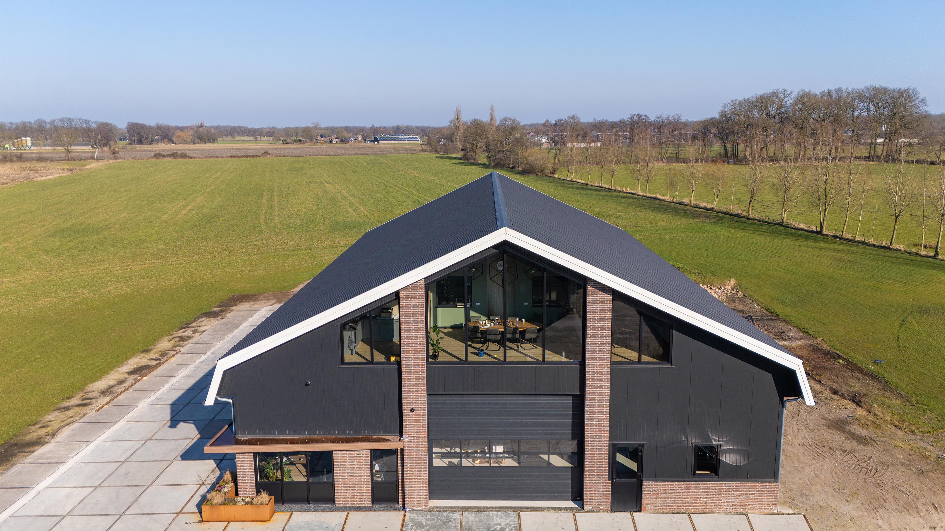 Het dak van het pand is gerealiseerd met ons vijfkroons dakpaneel in de kleur FALK Black Matt. Dit komt overeen met RAL 9005, maar dan met een schitterende matte afwerking. Ook de gevel is voorzien van een speciaal sandwichpaneel, de FALK 1060 WB, afgewerkt met de Rail 133 liniering. Deze liniering lijkt op een plankprofiel, met plankbreedtes van 133 mm. Omdat de plankgroeven lijken op de paneeloverlap, wordt deze als het ware gemaskeerd. De gevel is uitgevoerd in de kleur Colorcoat HPS200 Ultra Raven, wat overeenkomt met RAL 7021. Dit geeft een pand een robuuste uitstraling die goed past in de landelijke omgeving.