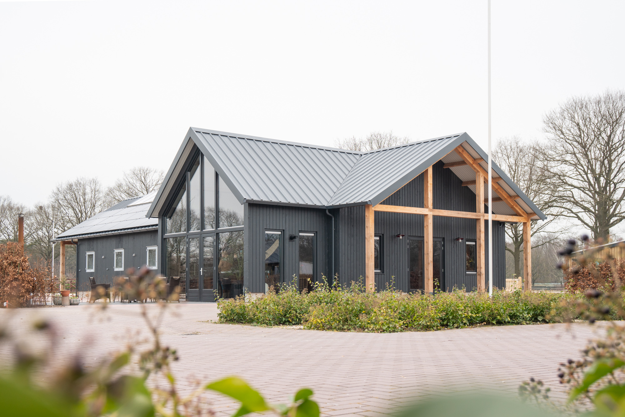 De nieuwe design paardenstal is ontworpen met het welzijn van de paarden als hoogste prioriteit. De stal is gebouwd met duurzame materialen die goed bestand zijn tegen weersinvloeden en die makkelijk schoon te maken zijn. Hierdoor is de stal hygiënisch en onderhoudsarm. De wanden zijn gerealiseerd met geïsoleerde houten panelen van zwart, Noord Europees gedroogd vurenhout. Op het dak zijn onze FALK 1100 TR3+ panelen toegepast in de kleur Anthracite (RAL 7016). De kronen op het sandwichpaneel geven het dak de uitstraling van een felsdak. Dankzij de toegepaste lichtnok is er voldoende licht in de stal voor een gezonde leefomgeving voor de paarden.