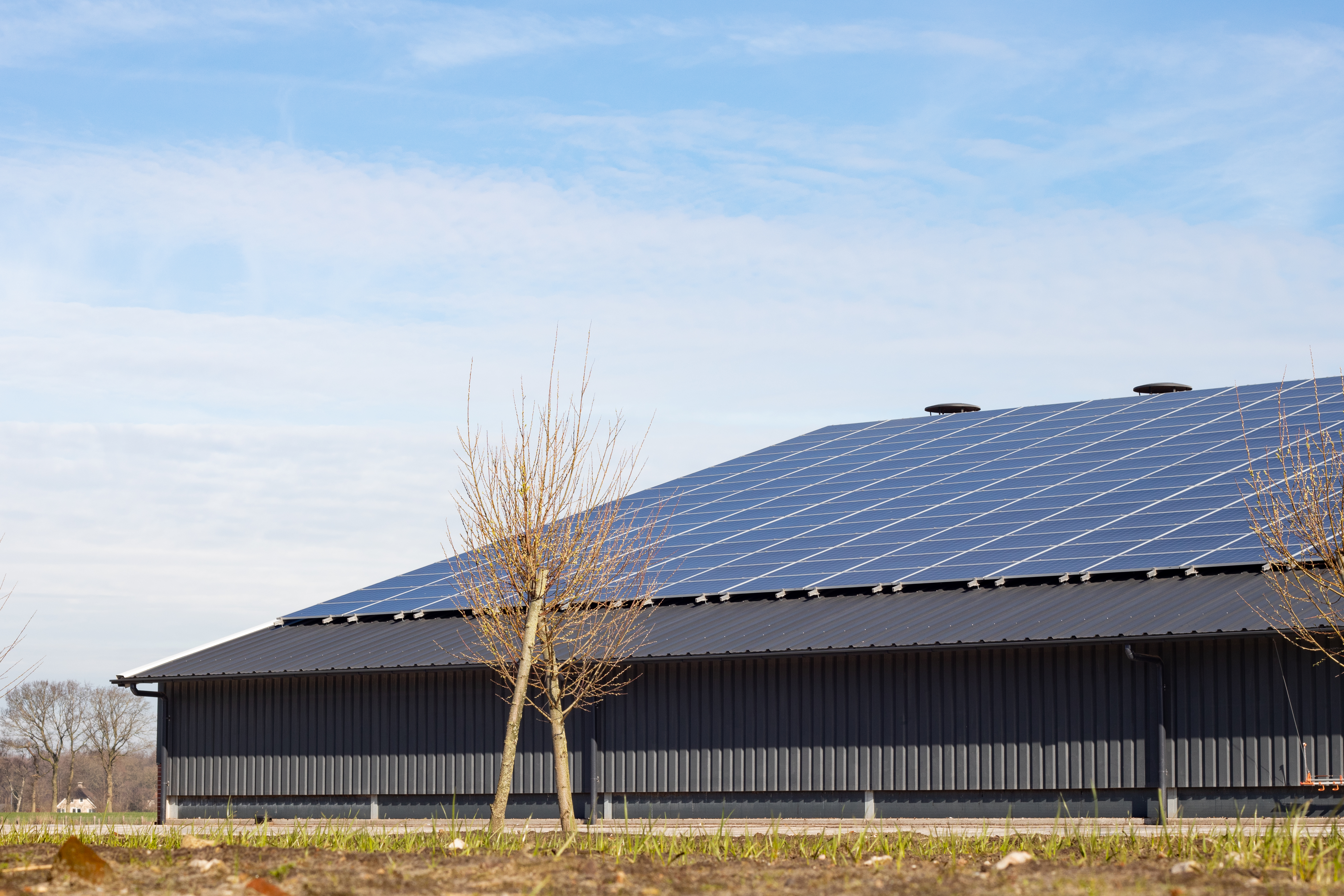 Deze nieuwbouw kippenstal in Barneveld is bedekt met een strak FALK dak. De stal is aan de binnenzijde voorzien van een agricoating en de buitenzijde is bedekt met zonnepanelen.