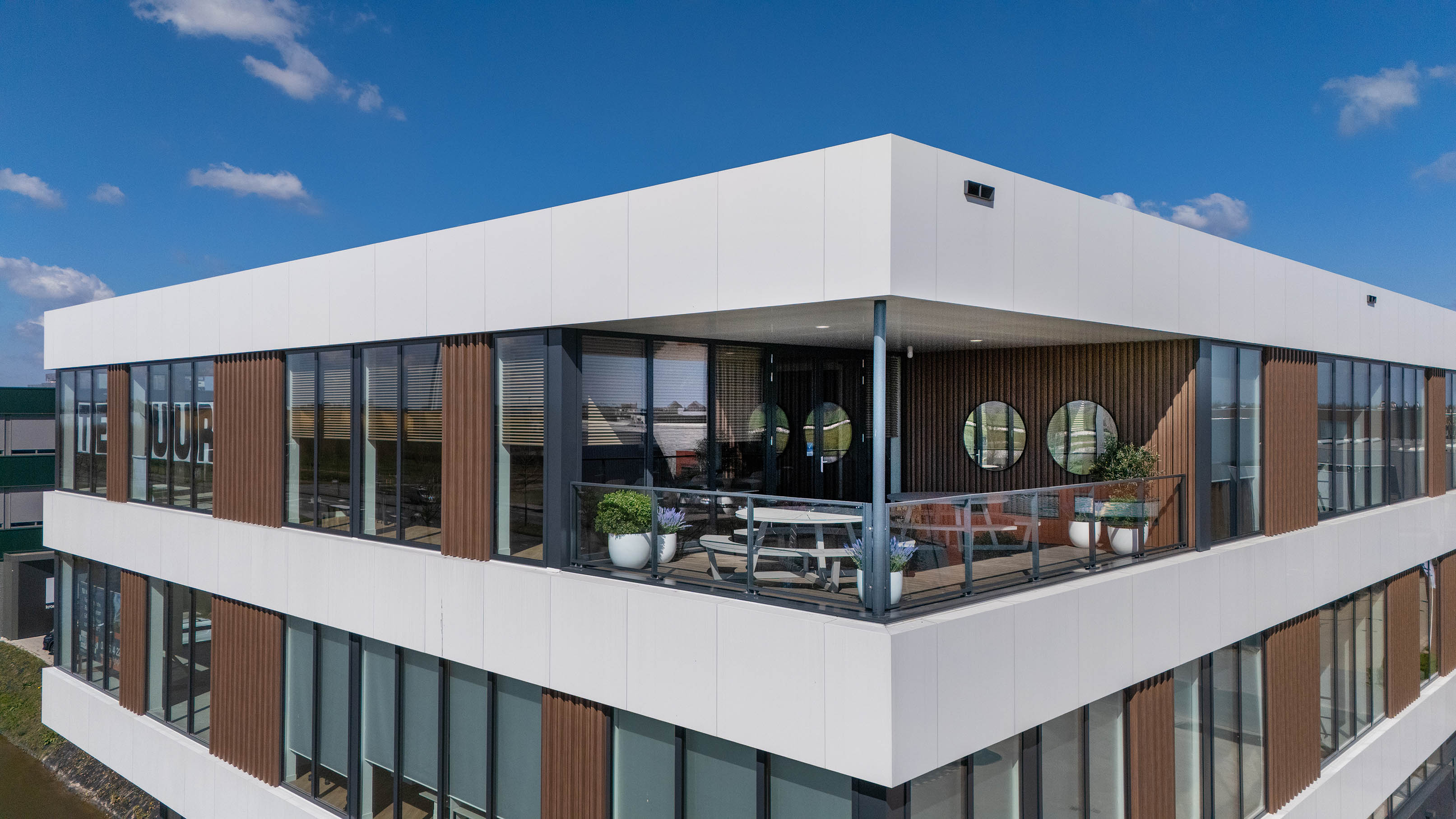 Het pand aan de Lichtschip in Houten is een schitterend voorbeeld van hoe duurzaamheid en design hand in hand gaan. Op een fraaie locatie aan het water verrees het duurzame kantoorpand.
