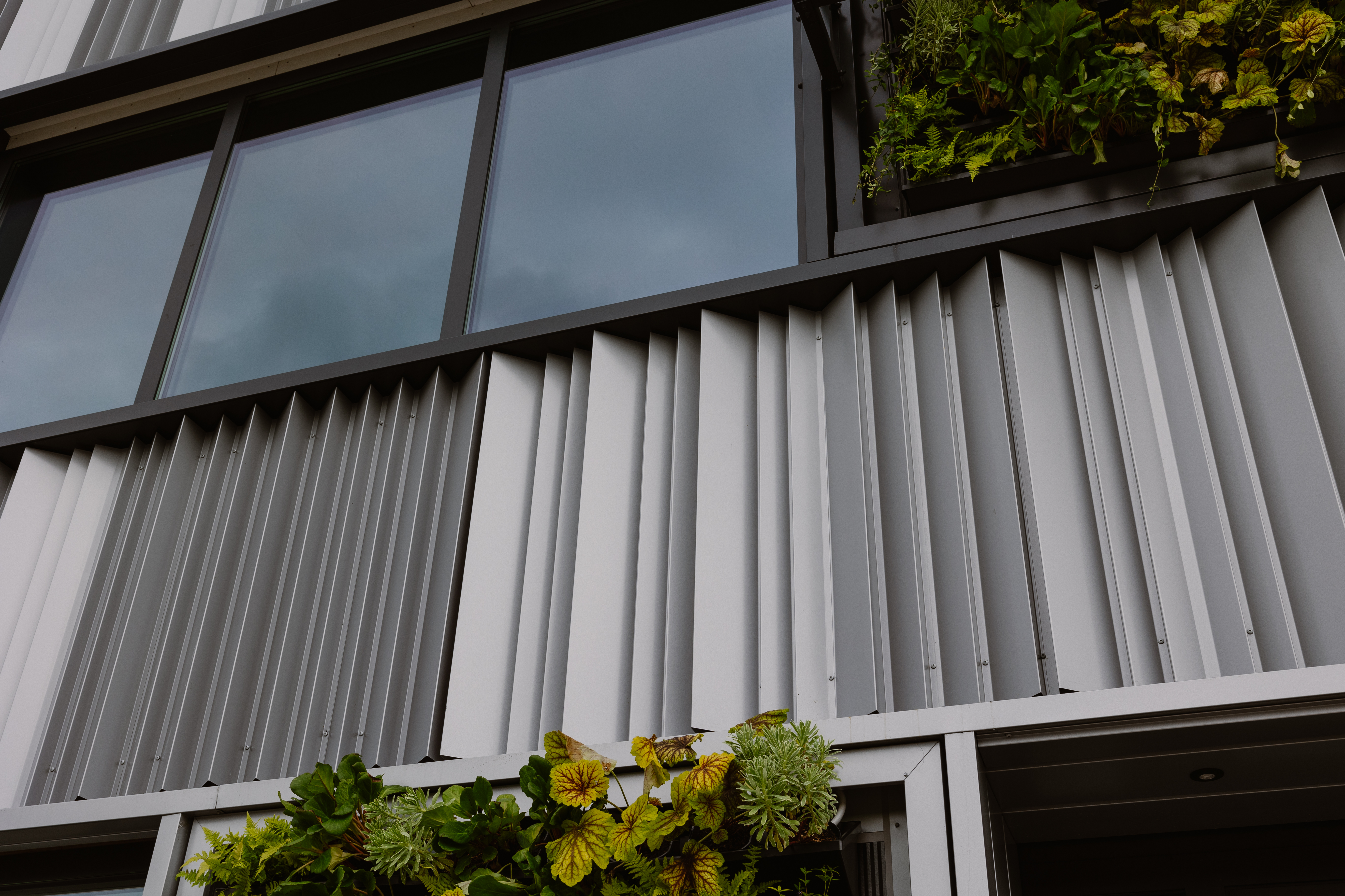 Het kantoor is gebouwd met een achter constructie bestaande uit het FALK Carrierpaneel, waarop het prachtige designprofiel, de FALK Spike, is bevestigd. Hier is gekozen om Spike 2 en Spike 3 gemengd toe te passen in de kleur Sirius. Door het grillige patroon van het Spike profiel is hier een levendige kleurschakering te zien. Dat zorg voor de perfecte verbinding tussen kantoor (RAL 9006) en de hal (RAL 9007).